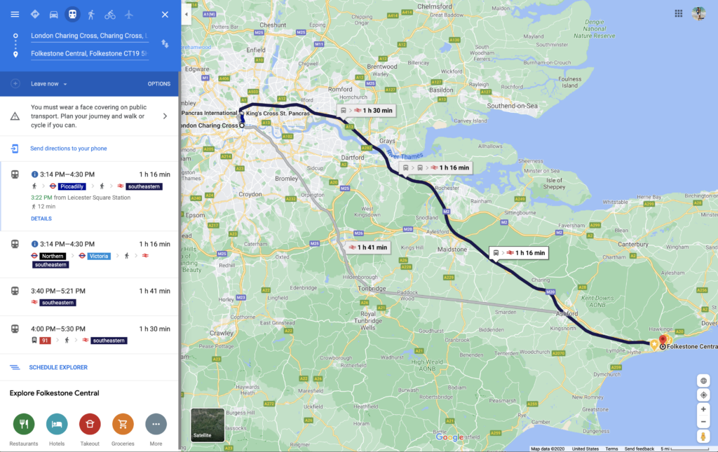 A train going down from Charing Cross Station to Folkestone Central Station.